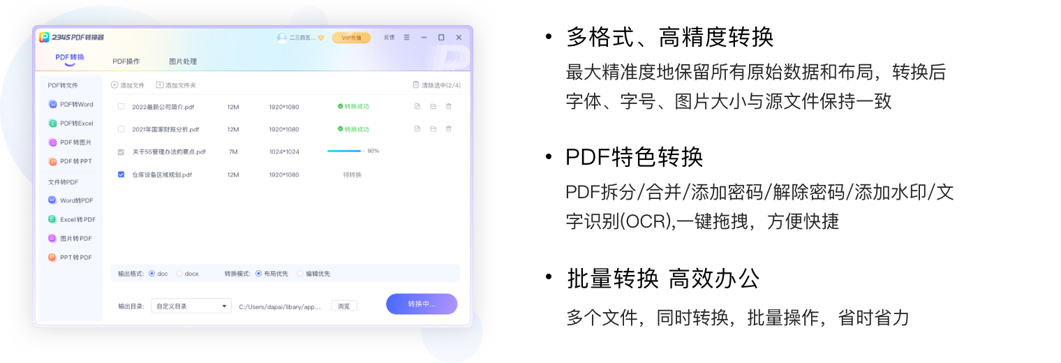2345PDF轉(zhuǎn)換器,是一款功能強大、操作簡單的PDF轉(zhuǎn)換軟件,支持PDF文檔和Word、PPT、Excel、圖片等文檔多種格式之間的互轉(zhuǎn);同時支持PDF拆分、PDF合并、PDF添加和解除密碼、圖片處理以及OCR文字識別等功能。文件轉(zhuǎn)換格式豐富、轉(zhuǎn)換質(zhì)量好、產(chǎn)品界面操作便捷,是新一代文件格式轉(zhuǎn)換工具。 了解更多