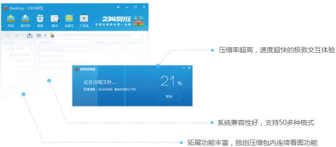 2345好壓是國內(nèi)自主研發(fā)的免費壓縮軟件。無論在速度,易用性還是安全性方面均表現(xiàn)出色,完美兼容包括Win8在內(nèi)的所有WINDOWS系統(tǒng),完美支持RAR5、ZIPX和ALZ格式的解壓,能夠壓縮LZH格式,支持格式多達(dá)51種。 了解更多