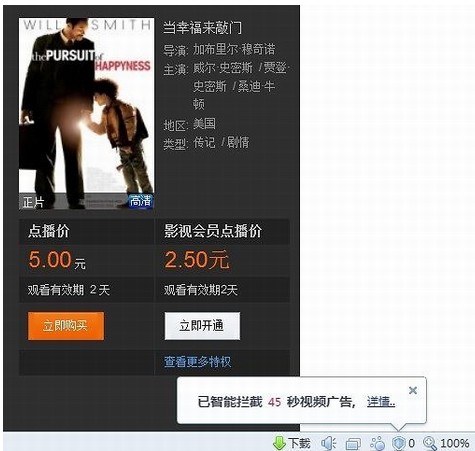 安裝完畢后,打開(kāi)2345智能瀏覽器,其智能攔截的功能便自動(dòng)開(kāi)啟。此時(shí),點(diǎn)擊某視頻網(wǎng)站并打開(kāi)影片《當(dāng)幸福來(lái)敲門》,瀏覽器右下角立刻彈出“已智能攔截45秒視頻廣告”的氣泡。不知不覺(jué)中,2345智能瀏覽器已為用戶省去了大量時(shí)間,以后每位電影達(dá)人都可以輕松看電影,再不受視頻廣告的騷擾了!