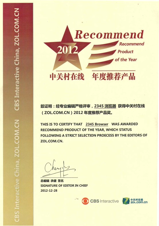 此次中關(guān)村在線(xiàn)為2345瀏覽器頒布年度推薦產(chǎn)品獎(jiǎng),這是對(duì)產(chǎn)品的莫大鼓勵(lì)和認(rèn)可。2345瀏覽器將繼續(xù)不斷優(yōu)化功能和性能,提升產(chǎn)品體驗(yàn),完善用戶(hù)需求,在騷擾廣告攔截和其他功能上繼續(xù)前進(jìn)!