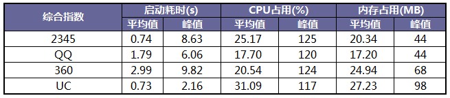 據(jù)權(quán)威部門最新發(fā)布的《安卓手機(jī)瀏覽器性能對(duì)比測(cè)試報(bào)告》中指出,對(duì)于當(dāng)前120余款熱門機(jī)型在安裝、卸載、啟動(dòng)、運(yùn)行APP的測(cè)試反應(yīng)中,2345手機(jī)瀏覽器在啟動(dòng)耗時(shí)、CUP占用、內(nèi)存占用等方面的表現(xiàn)較為突出。從2345和QQ、360及UC的綜合對(duì)比數(shù)據(jù)來(lái)看,2345手機(jī)瀏覽器的啟動(dòng)耗時(shí)明顯低于QQ和360,內(nèi)存占用率位居第二,僅次于QQ。
