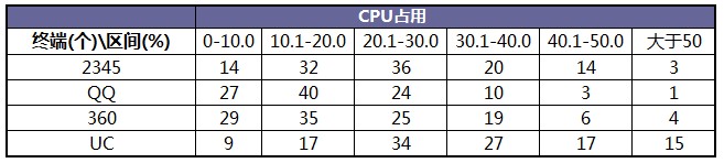 從CPU占用百分比來(lái)看,2345手機(jī)瀏覽器的占用率大致在10%-40%之間,相對(duì)于QQ和360的占用率較高一些。而UC的CPU占用率最高,其CPU占用率超過(guò)50%的機(jī)型多達(dá)15款,占所有機(jī)型的12.5%。