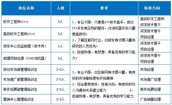 2345.com2014年校園招聘即將熱力啟動(dòng),八大職位,具有競(jìng)爭力的薪資待遇,CEO親自宣講,副總裁帶隊(duì)培養(yǎng),就等你來!
