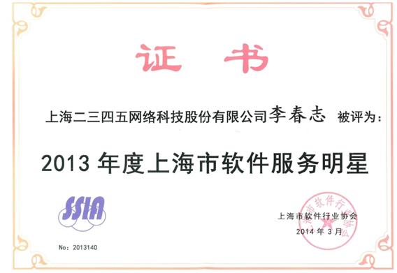 2014年3月26日下午,上海市軟件行業(yè)協(xié)會2014年工作年會暨“上海市軟件行業(yè)標兵&軟件行業(yè)服務明星”評選活動頒獎典禮在上海市經(jīng)濟管理干部學院禮堂舉行。上海市經(jīng)信委、科委、發(fā)改委、商務委等相關部門負責人,相關產(chǎn)業(yè)園區(qū)(基地)、行業(yè)協(xié)會、軟件企業(yè)負責人及十余家媒體記者,約300人到會。本次評選活動中二三四五董事長龐升東獲得軟件行業(yè)標兵稱號,二三四五軟件研發(fā)中心李春志獲得軟件服務明星稱號。