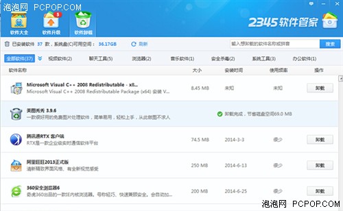 筆者了解到,2345軟件管家包含3000余款正版軟件,且在技術(shù)層面對(duì)設(shè)置了流氓捆綁的軟件進(jìn)行了修正,用戶可以放心選擇安裝;同時(shí),2345軟件管家可智能識(shí)別電腦中已經(jīng)安裝的軟件,用戶只需輕輕點(diǎn)擊,便可完成卸載,對(duì)令用戶苦惱的卸載殘留更是提供了“強(qiáng)力清掃”功能,使卸載真正一步到位。