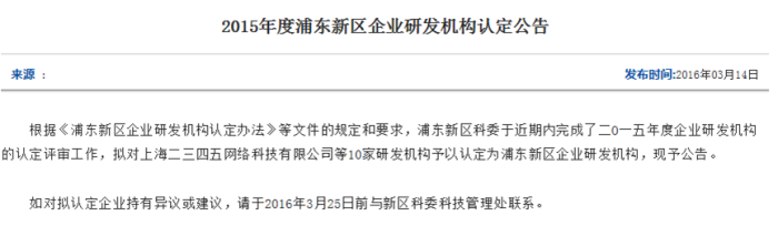 3月14日,上海市浦東新區(qū)科學(xué)技術(shù)委員會正式公示“2015年度企業(yè)研發(fā)機(jī)構(gòu)”認(rèn)定名單,上海二三四五網(wǎng)絡(luò)科技有限公司(簡稱“2345.com”)等10家研發(fā)機(jī)構(gòu)榜上有名。