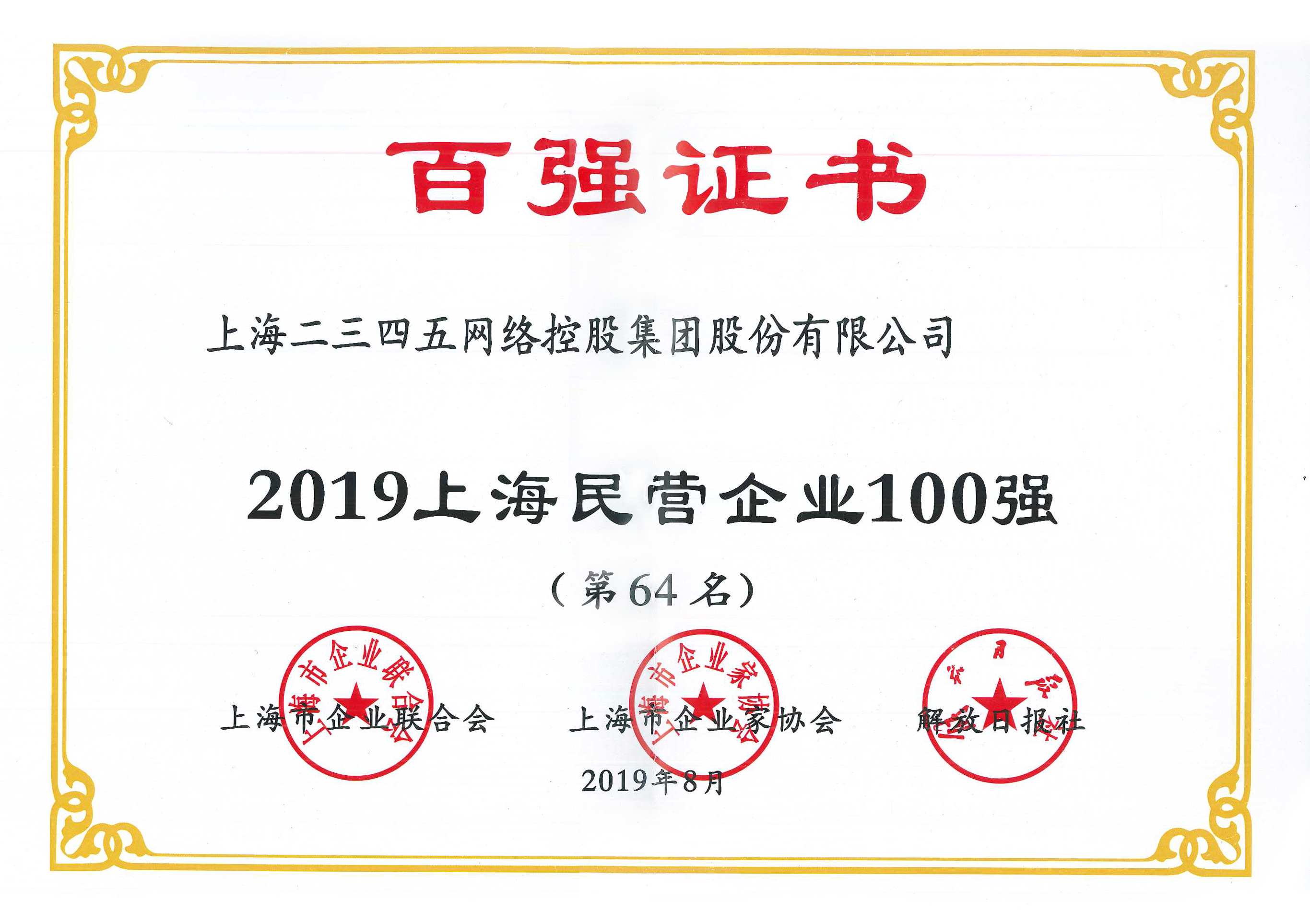 8月19日,上海市企業(yè)聯(lián)合會、上海市企業(yè)家協(xié)會、上海市經(jīng)濟團體聯(lián)合會聯(lián)合發(fā)布2019上海百強企業(yè)榜單,上海二三四五網(wǎng)絡(luò)控股集團股份有限公司(簡稱“二三四五”,股票代碼002195)再次登榜,榮居上海民營企業(yè)百強排行64名,較上年上升5名。二三四五還同時蟬聯(lián)上海服務(wù)業(yè)企業(yè)100強和上海民營服務(wù)業(yè)企業(yè)100強。