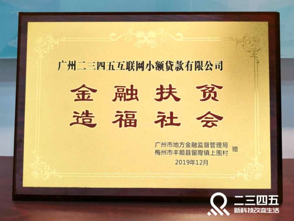 12月18日廣州市金融局召開(kāi)廣州市金融行業(yè)扶貧工作會(huì)議,對(duì)2019年助力扶貧的企業(yè)進(jìn)行授牌,并授予二三四五旗下子公司廣州二三四五互聯(lián)網(wǎng)小額貸款有限公司(以下簡(jiǎn)稱(chēng)“廣州二三四五小貸公司”)“金融扶貧 造福社會(huì)”榮譽(yù)。