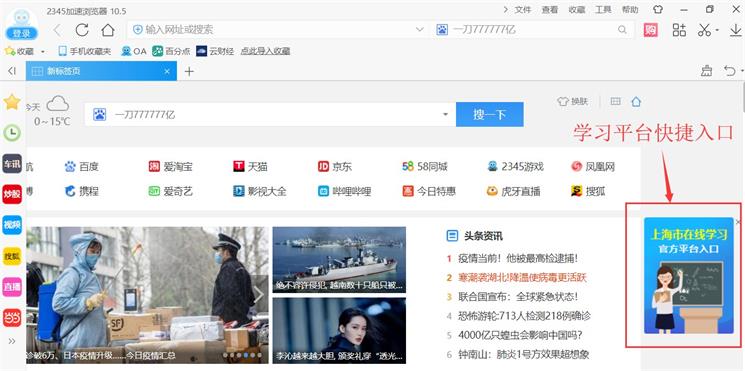 據(jù)悉,有些家長(zhǎng)不懂功能操作搗鼓兩小時(shí),耽擱了孩子的在線學(xué)習(xí),上演大型“翻車現(xiàn)場(chǎng)”。目前2345加速瀏覽器已在其新標(biāo)簽頁(yè)提供“上海市在線學(xué)習(xí)官方平臺(tái)入口”,無(wú)需輸入網(wǎng)址即能一鍵打開(kāi)學(xué)習(xí)平臺(tái)。其瀏覽器也提供了收藏夾功能,可將平臺(tái)地址一鍵添加到收藏夾,擁有更多方便快捷的進(jìn)入平臺(tái)方式。