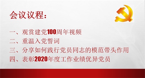 會議開始,黨員們觀看了建黨100周年視頻,跟著視頻回顧了黨建立百年以來的光輝歷程,不忘歷史,展望未來。之后,在黃國敏書記的帶領(lǐng)下,所有參會黨員重溫了入黨誓詞,再一次明確了自己的責任和使命,堅定了作為共產(chǎn)黨員的理想信念。