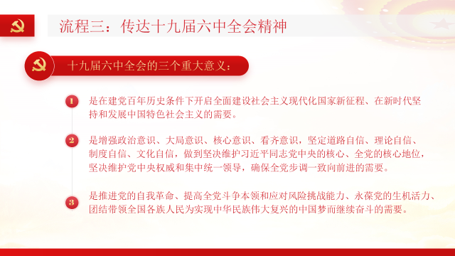 會議流程三,向各位黨員傳達(dá)黨的十九屆六中全會精神,強(qiáng)調(diào)十九屆六中全會召開的重大意義。號召各位黨員貫徹并落實(shí)“兩個(gè)維護(hù)”的重要內(nèi)容,即“堅(jiān)決維護(hù)習(xí)近平同志黨中央的核心、全黨的核心地位,堅(jiān)決維護(hù)黨中央權(quán)威和集中統(tǒng)一領(lǐng)導(dǎo)”。