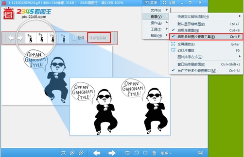 首先,獨(dú)有的多幀圖片查看工具支持GIF等多幀圖片的播放與單幀保存。最近十分流行鳥叔的江南STYLE騎馬舞步,用2345看圖王可以快速瀏覽學(xué)習(xí)每一個(gè)動(dòng)作,讓自己時(shí)刻處于時(shí)尚潮流的前端。
