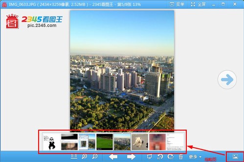 其次,2345看圖王擁有縮略圖功能,點(diǎn)擊看圖窗口右下角“縮略圖”按鈕,顯示縮略圖欄??s略圖欄顯示內(nèi)容是當(dāng)前圖片所在文件夾中的所有圖片。在鼠標(biāo)滾輪功能設(shè)置為圖像縮放情況下,當(dāng)鼠標(biāo)指針在縮略圖欄區(qū)域內(nèi),我們可以通過鼠標(biāo)滾輪進(jìn)行翻頁(yè);而當(dāng)鼠標(biāo)指針在非縮略圖欄區(qū)域內(nèi),鼠標(biāo)滾輪的功能就變成放大縮?。ㄈ鐖D3)。我們可以在快速瀏覽圖片的同時(shí),關(guān)注圖片的每一個(gè)細(xì)節(jié),讓瀏覽圖片更高效。